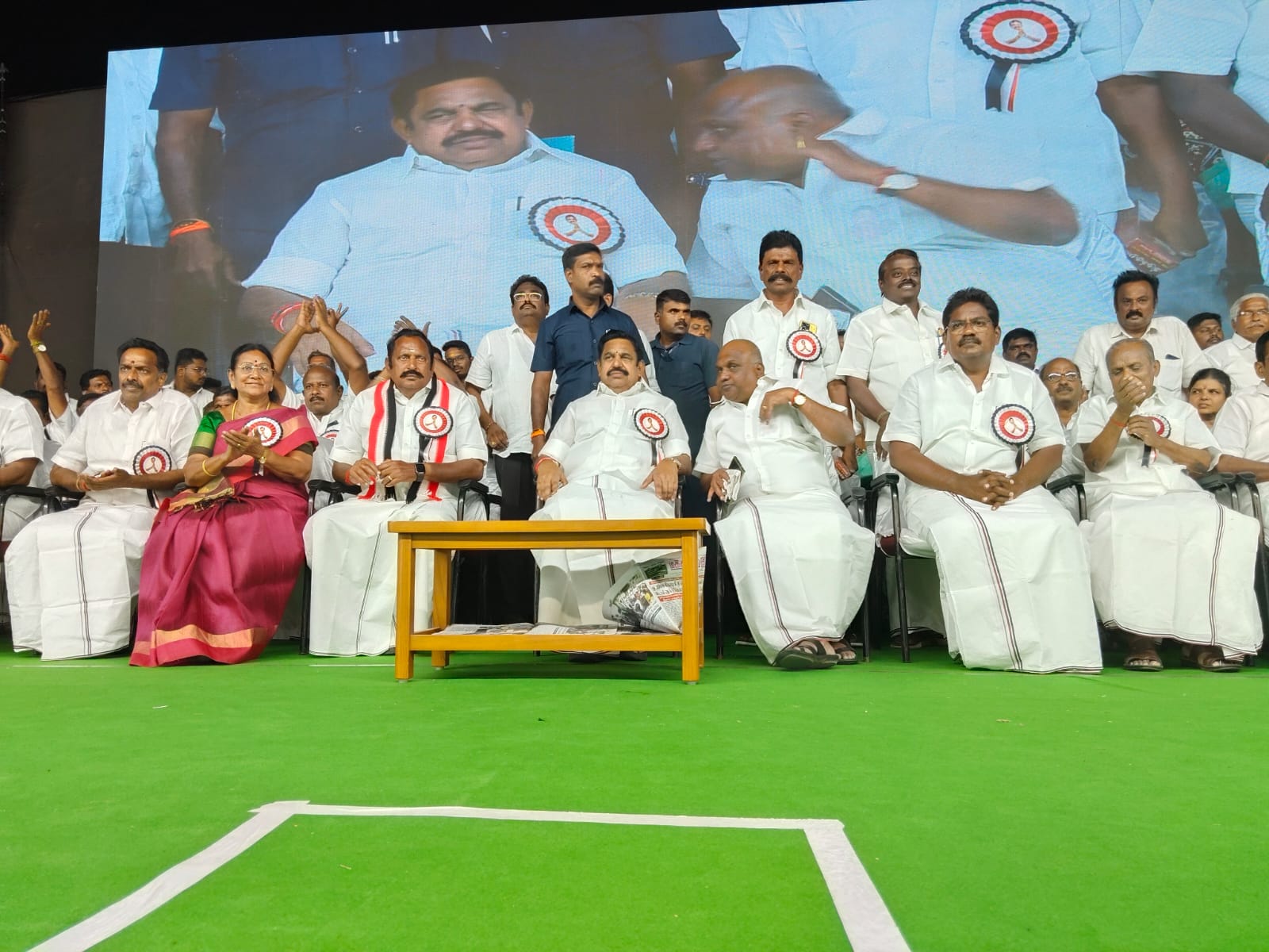 நாமக்கல்லில் நடைபெற்ற அதிமுக பிரச்சாரப் பொதுக்கூட்டத்தில், முன்னாள் முதல்வர் எடப்பாடி பழனிசாமி கலந்துகொண்டு, நாமக்கல் லோக்சபா தொகுதி அதிமுக வேட்பாளர் ராகா தமிழ்மணியை ஆதரித்து பேசினார். அருகில் முன்னாள் அமைச்சர்கள் தங்கமணி, விஜயபாஸ்கர், சரோஜா ஆகியோர்.