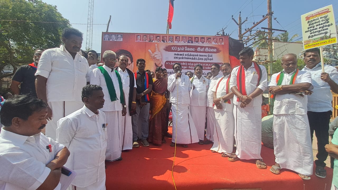 மயிலாடுதுறை மாவட்டம் சீர்காழி பழைய பேருந்து நிலையம் அருகே மதச்சார்பற்ற முற்போக்கு கூட்டணி சார்பில் காந்தியடிகள் பெயரை நீக்கி 100 நாள் வேலைத்திட்டத்தை ஒழிக்க சட்டம் கொண்டு வந்த ஒன்றிய பாஜக அரசையும் ஒத்து ஊதும் அதிமுகவையும் கண்டித்து கண்டன ஆர்ப்பாட்டம் நடைபெற்றது சீர்காழி எம்எல்ஏ பன்னீர்செல்வம் தலைமை வகித்தார்