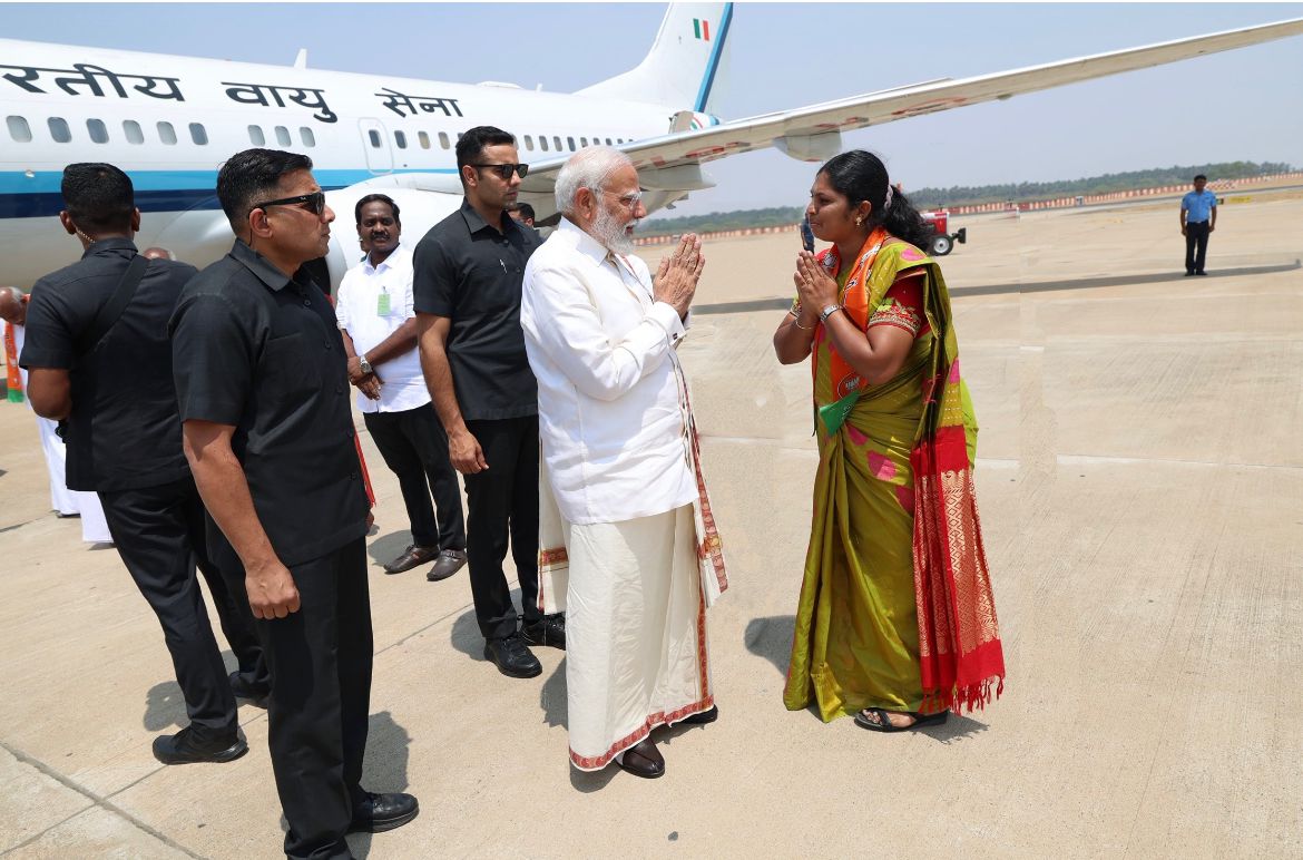 கொங்கு மண்டலத்திற்கு உட்பட்ட பாராளுமன்ற உறுப்பினர்களை ஆதரித்து மேட்டுப்பாளையம் பொது கூட்டத்திற்கு வருகை தந்த உலகின் விஸ்வ குரு பாரதப் பிரதமர் நரேந்திர மோடி அவர்களை கோவை விமான நிலையத்தில் நதியா நாகராஜன் கோவை மாவட்ட செயலாளர் வரவேற்று வாழ்த்துப் பெற்றா