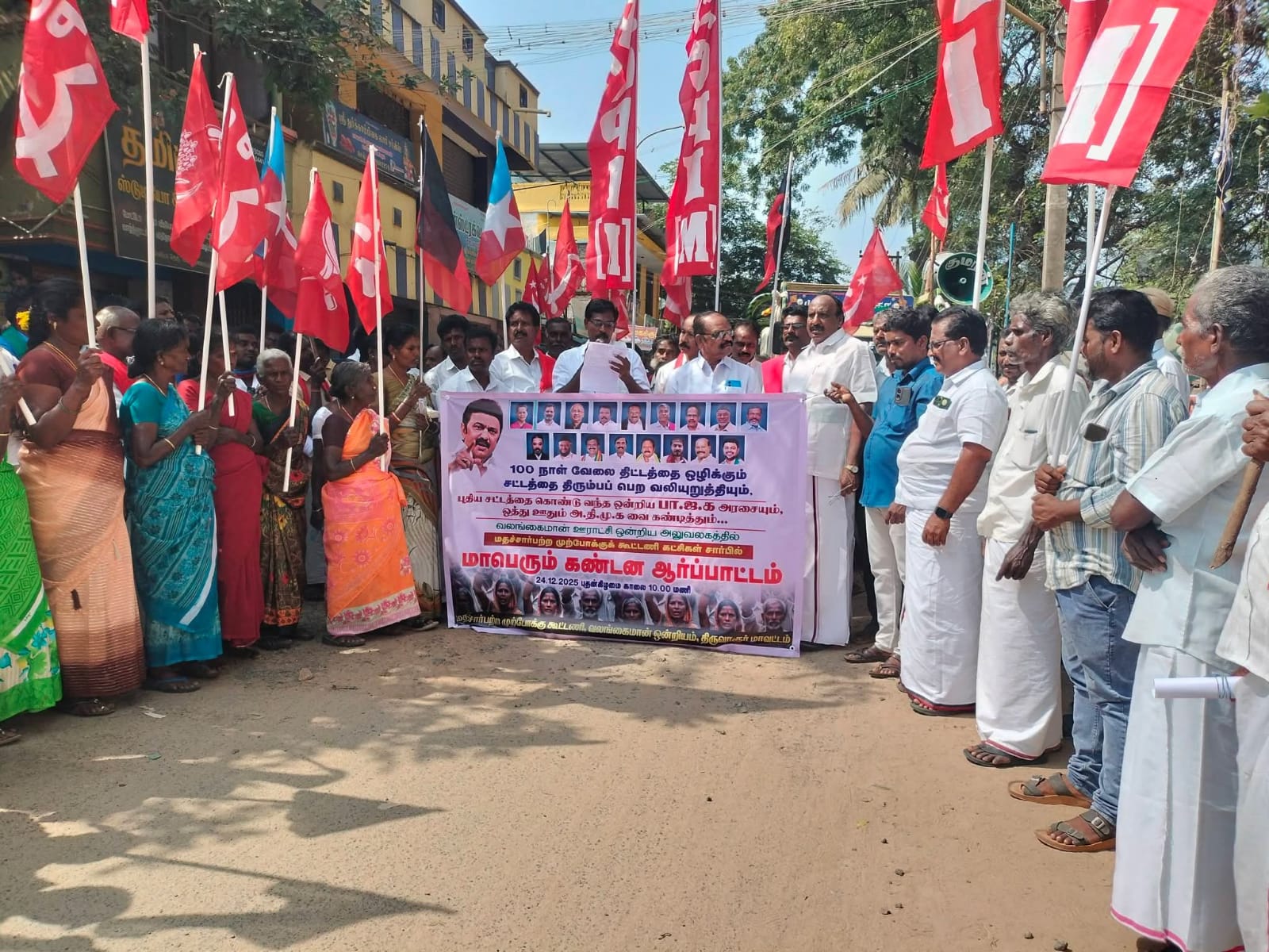 திருவாரூர் மாவட்டம் வலங்கைமான் ஊராட்சி ஒன்றிய அலுவலகம் முன்பாக மகாத்மா காந்தி பெயரில் செயல்பட்டு வந்த கிராமப்புற மக்களின் 100 நாள் வேலை உறுதித் திட்டத்தை ஒன்றிய பாஜக அரசு சீர்குலைத்துள்ளது, இதற்கு ஆதரவான நிலையை அதிமுக எடுத்துள்ளது. இது கிராமப்புற மக்களுக்கு செய்த அநீதி ஆகும். கிராமப்புற ஏழை மக்களின் வாழ்வாதாரத்தை மேம்படுத்த 2004 ஆண்டில் ஜக்கிய முற்போக்கு கூட்டணி அரசால் கொண்டுவரப்பட்ட 100 நாள் வேலை உறுதித் திட்டத்திலிருந்து மகாத்மா காந்தி பெயரை நீக்கி உள்ளனர்.