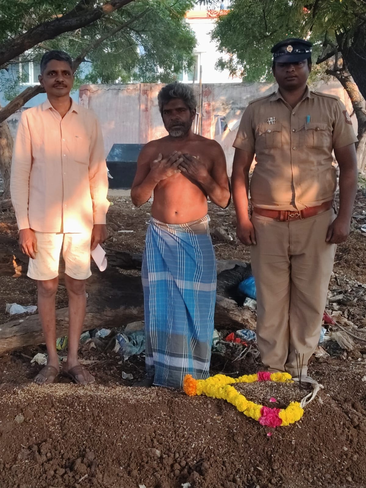 தகவலின் அடிப்படையில் திருச்சி குழுமிக் கரை மயானத்தில் துவரங்குறிச்சி இரண்டாம் நிலை காவலர் செல்வேந்திரன் முன்னிலையில் உரிமை கோரப்படாத உடலுக்கு உரிய மரியாதையுடன் இறுதி சடங்கு செய்து அமிர்தம் சமூக சேவை அறக்கட்டளை நிர்வாக அறங்காவலர் யோகா ஆசிரியர் விஜயகுமார் நல்லடக்கம் செய்தார்.