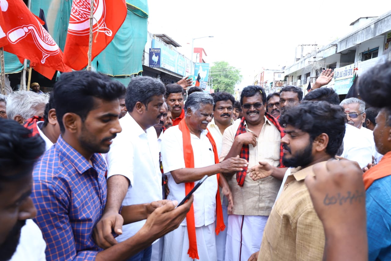 தேனி மாவட்டம் போடிநாயக்கனூர் நகருக்கு வருகை தந்த இந்திய கம்யூனிஸ்ட் கட்சியின் மாநில செயலாளர் முத்தரசன் தேனி பாராளுமன்ற தொகுதியின் வேட்பாளர் தங்க தமிழ்ச்செல்வனுக்கு ஆதரவாக உதயசூரியன் சின்னத்தில் வாக்கு கேட்டு நகரின் பிரதான பகுதிகளில் பிரச்சாரம் மேற்கொண்டார் பழைய பேருந்து நிலையம் வ உ சி சிலை அருகே 20 வது பகுதி சார்பாக இந்தியா கூட்டணி கட்சி நிர்வாகிகள் அவருக்கு மிகச் சிறப்பான வரவேற்பு அளித்தனர்