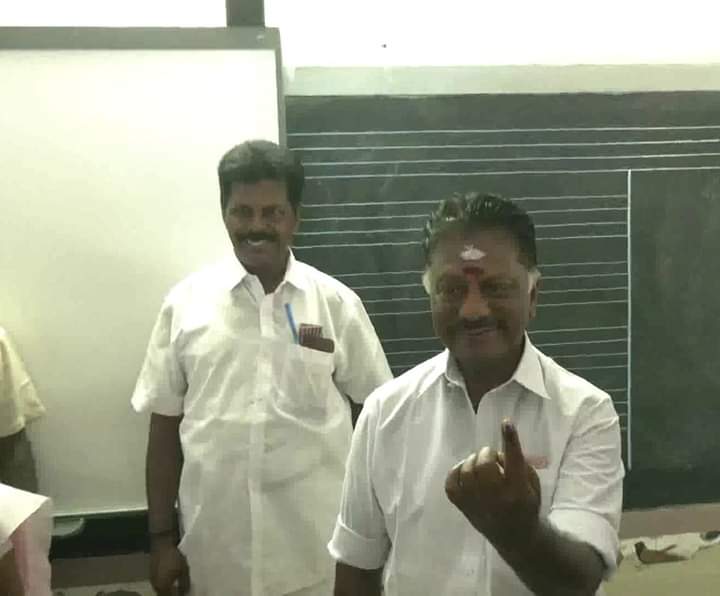 தேனி பெரியகுளத்தில் உள்ள வாக்குச்சாவடியில் வாக்களித்தார் ஓ.பன்னீர்செல்வம்
