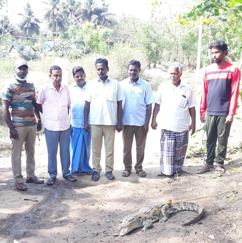 உத்தரவின் பேரில் வனவர் சண்முகம் தலைமையில் வனப்பணியாளர்கள் உடன் சென்று முதலையை கிராம நிர்வாக அலுவலர் முன்னிலையில் பத்திரமாக மீட்டு அணைக்கரை கொள்ளிடம் ஆற்றின் பாதுகாப்பாக விட்டனர் பின்னர் முதலை ஆற்றிற்குள் சென்று விட்டது.கிராம மக்கள் முன்எச்சரிகையுடன் பார்த்து விட்டதால், பெரும் உயிர்சேதம் தவிர்க்கப்பட்டது.
