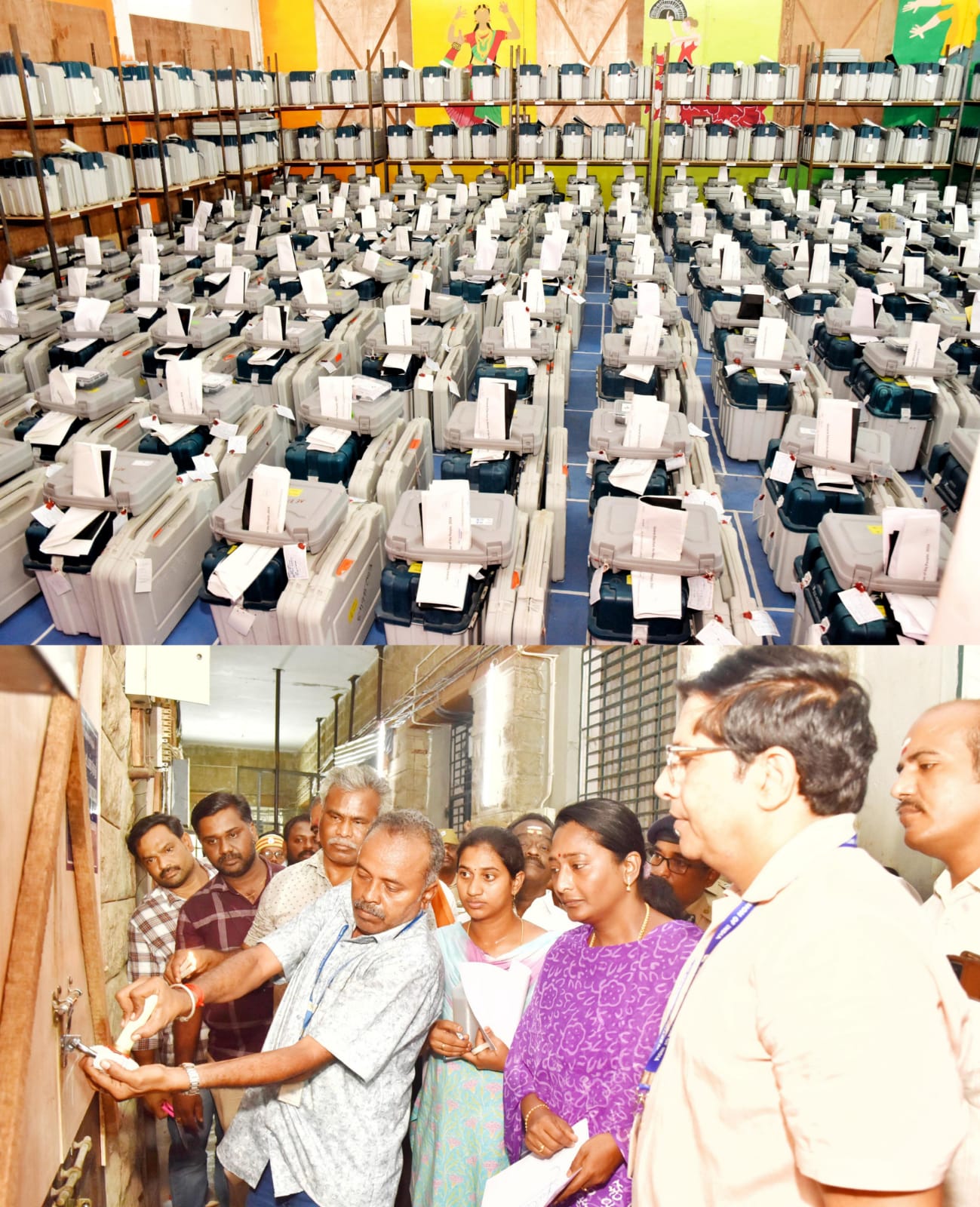 மதுரை மாவட்டம் நாடாளுமன்ற தேர்தல் வாக்குப்பதிவு முடிந்து வாக்குப்பதிவு இயந்திரங்களை மருத்துவக்கல்லூரி வாக்கு எண்ணும் மையத்தில் உள்ள பாதுகாப்பு அறையில் வைக்கப்பட்டு மாவட்ட தேர்தல் அலுவலர்/ மாவட்ட ஆட்சியர் சங்கீதா , மதுரை பாராளுமன்ற தொகுதிக்கான பொது பார்வையாளர் ராஜேஷ்குமார் யாதவ் , மாநகர காவல் ஆணையர் லோகநாதன் மற்றும் அங்கிகரிக்கப்பட்ட அரசியல் கட்சி பிரதிநிதிகள் ஆகியோர் முன்னிலையில் பார்வையிட்டு சீல் வைக்கப்பட்டது.சீல் வைக்கப்பட்ட அறைக்கு துப்பாக்கி ஏந்திய காவல் துறையினர் பாதுகாப்பில் ஈடுபட்டுள்ளனர்.