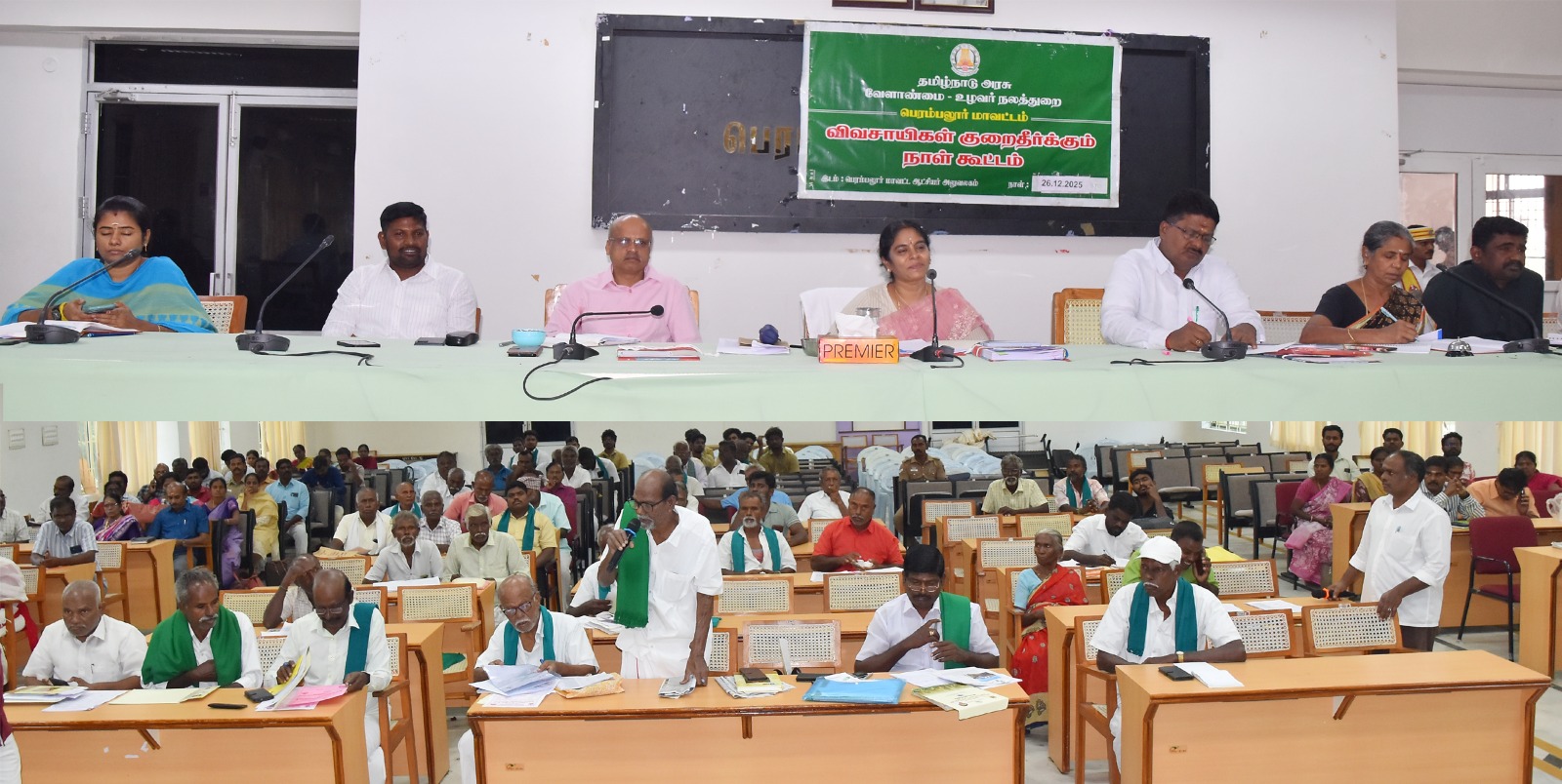 பெரம்பலூர்.டிச.26. பெரம்பலூர் மாவட்ட ஆட்சியர் அலுவலக கூட்டரங்கில், வேளாண்மை மற்றும் உழவர் நலத்துறையின் சார்பில், விவசாயிகள் குறைதீர்க்கும் நாள் கூட்டம் மாவட்ட ஆட்சித்தலைவர் ந.மிருணாளினி, தலைமையில் நடைபெற்றது.