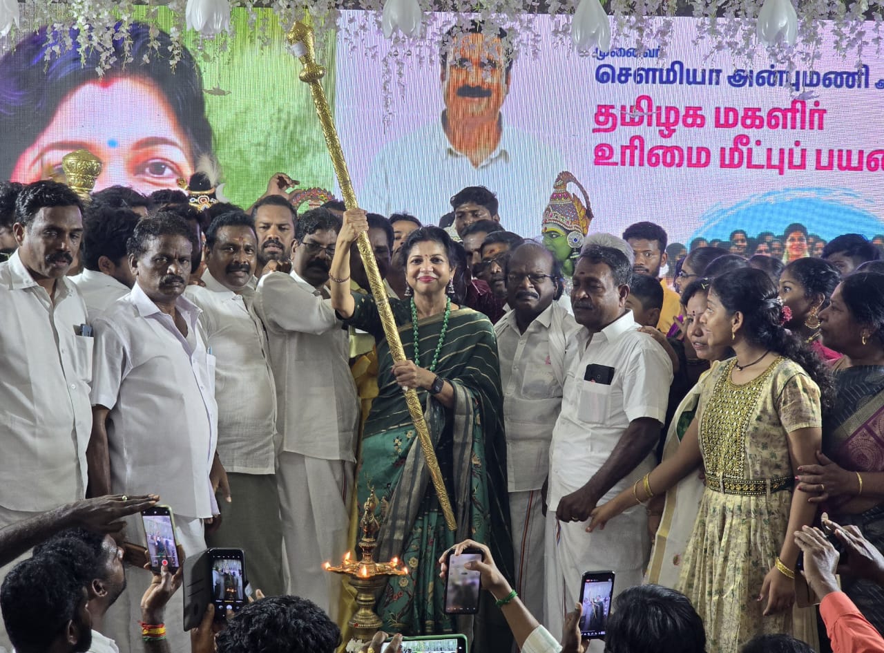 மயிலாடுதுறை தனியார் திருமண மண்டபத்தில் தமிழக மகளிர் உரிமை மீட்பு பயணம் நிகழ்ச்சியில் சௌமியா அன்புமணி பங்கேற்றார். பேண்ட் வாத்தியங்கள் முழங்க பாமக மாவட்ட செயலாளர் சித்தமல்லி பழனிச்சாமி தலைமையில் சிறப்பாக வரவேற்பு அளிக்கப்பட்டது. சௌமியா அன்புமணிக்கு செங்கோல் வழங்கப்பட்டது.