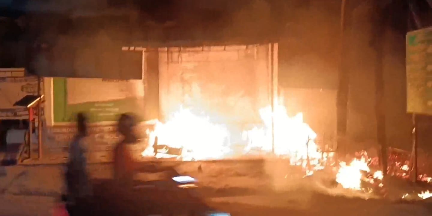 பல்லடம் அருகே சீட் கவர் தைக்கும் கடையின் முன்பு பயங்கர தீ விபத்து…. பல மணி நேரம் போராடி அணைத்த தீயணைப்புத்துறையினர்