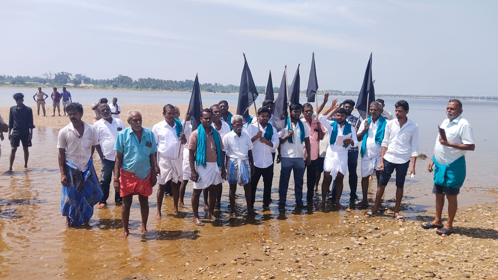 மாவட்ட விவசாயிகளின் கோரிக்கைகளை, தமிழ்நாடு முதலமைச்சரின் கவனத்திற்கு கொண்டு செல்லும் வகையில் கருப்பு கொடியுடன் காவிரி ஆற்றில் இறங்குவதாக அறிவித்தனர்.
