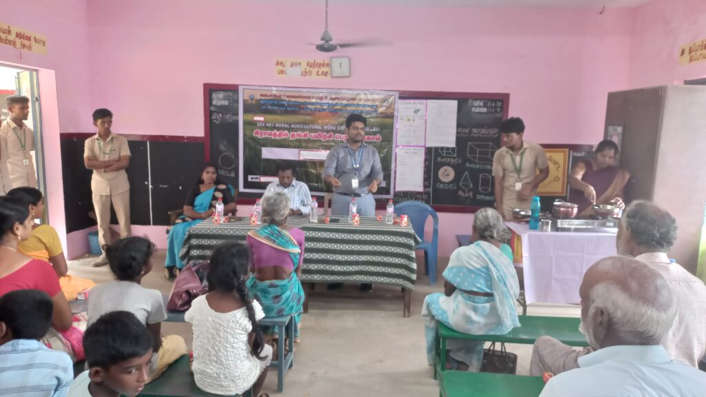 தட்சிணாமூர்த்தி சுந்தரவடிவு திட்ட பொருப்பாளர் வேல்பிரபாகரன சந்தோஷ் குமார் ஆண்டு ஒருங்கிணைப்பாளர் பிருந்தா தேவி ஆகியோரின் அறிவுறுத்தலின் பேரில் உணவு மதிப்பு கூட்டுதல் பற்றிய பயிற்சி நெல் விதைகள் கண்காட்சி அங்கக வேளாண்மை பொருட்கள் கண்காட்சி நடைபெற்றது