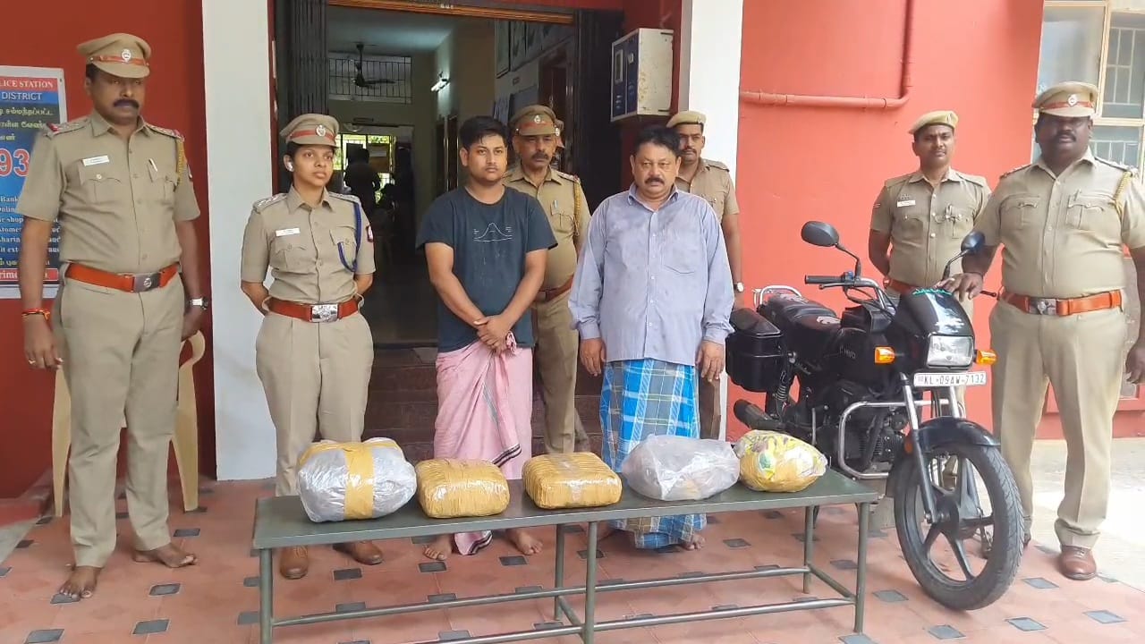 பொள்ளாச்சி அருகே கஞ்சா கடத்தி வந்த தந்தை மகன் இருவர் கைது. கடத்தலுக்கு பயன்படுத்தப்பட்ட இருசக்கர வாகனம் பறிமுதல்.
