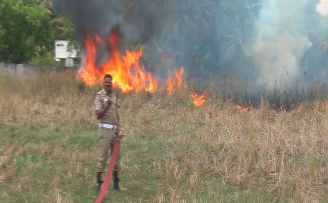 இந்நிலையில் அடையாளம் தெரியாத நபர்கள் சிகரெட் துண்டுகளை வீசியதில் காய்ந்த ஜம்பு தீ பிடித்து எரியத்துவங்கியது. சிறிது நேரத்தில் மளமளவென பரவி சுமார் 5 ஏக்கர் விவாய நிலத்தில் இருந்த ஜம்பு முற்றிலும் எரியத்துவங்கியது. சுமார் 20 அடி உயரம் வரை தீ எரிந்ததால் நிலத்தில் இருந்த 20ற்கும் மேற்பட்ட தென்னை மரங்களில் இருந்த சருகுகள் தீ பிடித்து தென்னை மரங்களும் எரிந்தன.