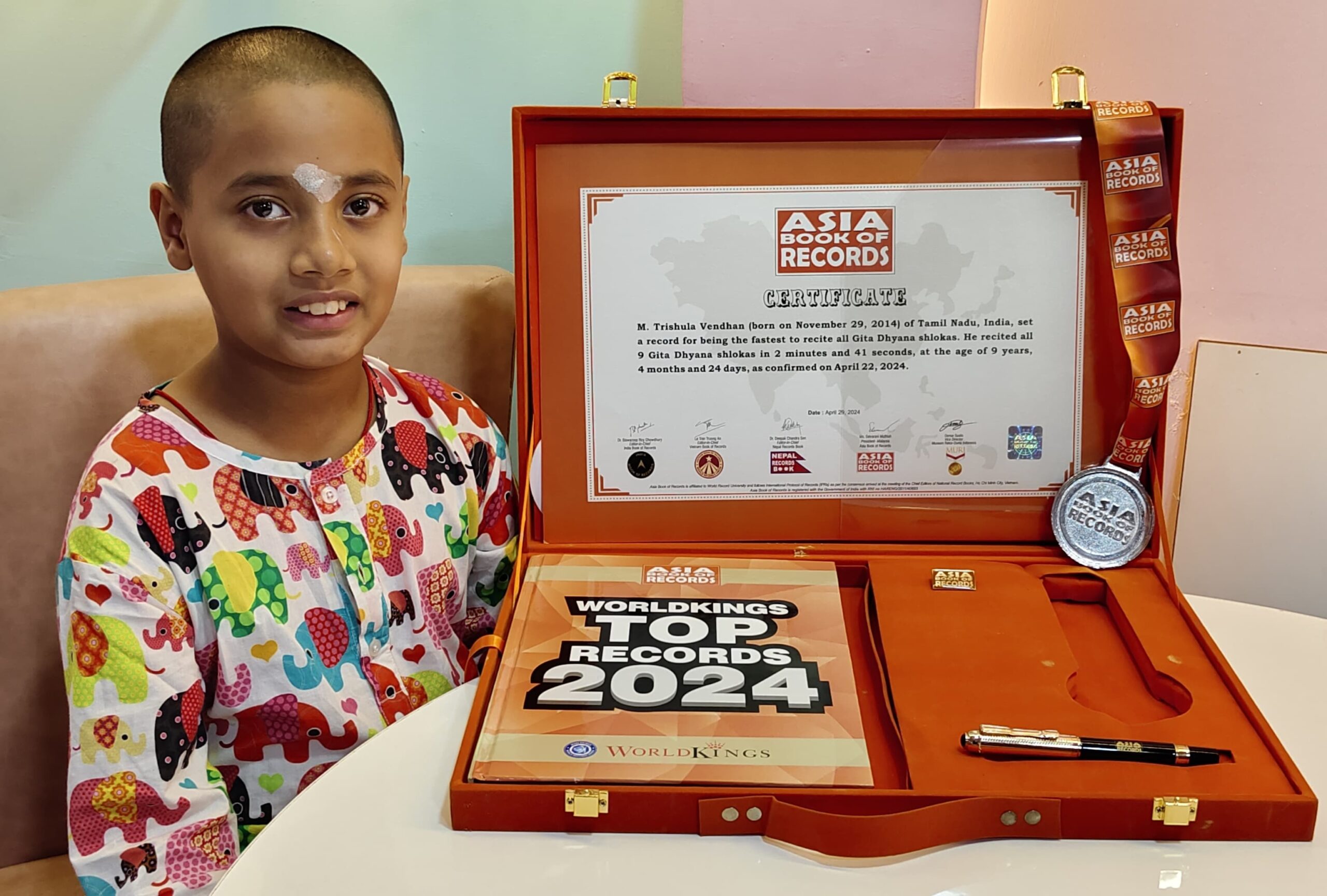 இந்த நிலையில் சிறுவன் ஒன்பது அத்தியாங்கள் கொண்ட கீதா தியானா ஸ்லோகங்களை அச்சு பிசகாமல் தெளிவாக கூற துவங்கியுள்ளார்.சிறுவன் திரிசூல வேந்தனுக்கு முறையாக அளித்த பயிற்சியால், சமஸ்கிருத மொழியில் கீதா தியானா ஸ்லோகங்களை 2 நிமிடம் 41 விநாடிகளில் கூறி அசத்தியுள்ளார்.இவரது இந்த சாதனை ஆசிய உலக சாதனை புத்தகத்தில் இடம் பிடித்துள்ளது..இதே போல ஆசியா ஐகான் விருதையும் இவர் பெற்றுள்ளார்..