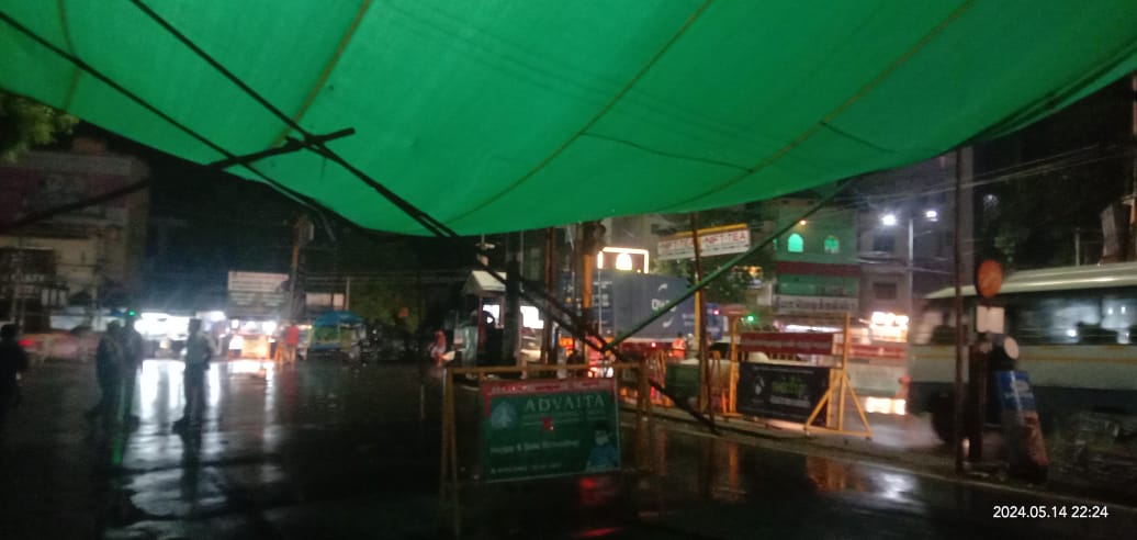 தற்காலிக பச்சை நிற நிழற்கூரை பந்தல் சூறாவளி காற்றின் காரணமாக முறிந்து விழுந்தது. போக்குவரத்து பாதிப்பு.