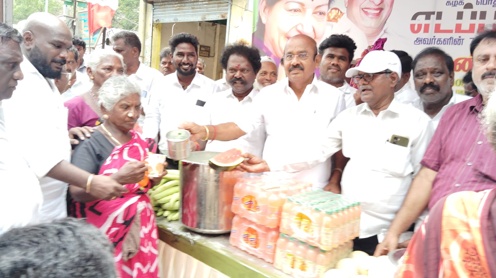 சட்டமன்ற எதிர்க்கட்சித் தலைவர் முன்னாள் முதல்வர் எடப்பாடி கே பழனிச்சாமி அவர்களின் பிறந்தநாளை முன்னிட்டு துறைமுகம் தொகுதி தெற்கு பகுதி 60வது வடக்கு வட்டம் ராயபுரம் மேம்பாலம் அருகே வட்டக் கழக செயலாளர் சி கே வில்வம் தலைமையிலும் தெற்கு பகுதி கழக செயலாளர் வெற்றிலை கே மாரிமுத்து முன்னிலையில் நடந்த நீர் மோர் பந்தல் திறப்பு விழா நிகழ்ச்சியில் வடசென்னை தெற்கு மேற்கு மாவட்ட கழக செயலாளர் நா பாலகங்கா கலந்துகொண்டு பொதுமக்களுக்கு இளநீர் தர்பூசணி மோர் மற்றும் பழ வகைகளை வழங்கினார்