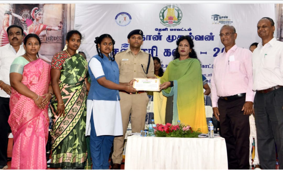 தேனி மாவட்டம் வடபுதுப்பட்டி நாடார் சரஸ்வதி கலை மற்றும் அறிவியல் கல்லூரி கூட்ட அரங்கில் நடைபெற்ற கல்லூரி கனவு நிகழ்ச்சியில் மாவட்ட ஆட்சித் தலைவர் ஷ ஜீவனா தேனி மாவட்டம் உத்தமபாளையம் அருகே உள்ள கோம்பையில் உள்ள ஸ்ரீ கன்னிகா பரமேஸ்வரி அரசு உதவி பெறும் மேல்நிலைப் பள்ளியில் 12 ஆம் வகுப்பு பொதுத்தேர்வில் 600 க்கு 541 மதிப்பெண்கள் பெற்ற கண்பார்வையற்ற மாணவி பி சண்முகப்பிரியாவுக்கு பாராட்டு சான்றிதழை வழங்கி அவரை ஊக்குவித்தார் உடன் மாவட்ட எஸ்பி ஆர் சிவ பிரசாத் உள்ளிட்ட பலர் உள்ளனர்