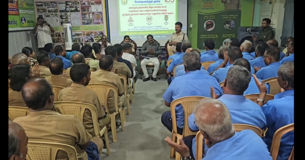 இதில் சிறப்பு விருந்தினராக பயிற்சி டி.எஸ்.பி.ஜெயஶ்ரீ, போக்குவரத்து கழக பொது மேலாளர் தட்சிணாமூர்த்தி,போக்குவரத்து காவல் ஆய்வாளர் லோகநாதன் உள்ளிட்டோர் கலந்து கொண்டு சாலை விபத்துக்களை தவிர்க்க மேற்கொள்ள வேண்டிய நடவடிக்கைகள் குறித்து பல்வேறு ஆலோசனைகளை வழங்கி விழிப்புணர்வு ஏற்படுத்தினர்.