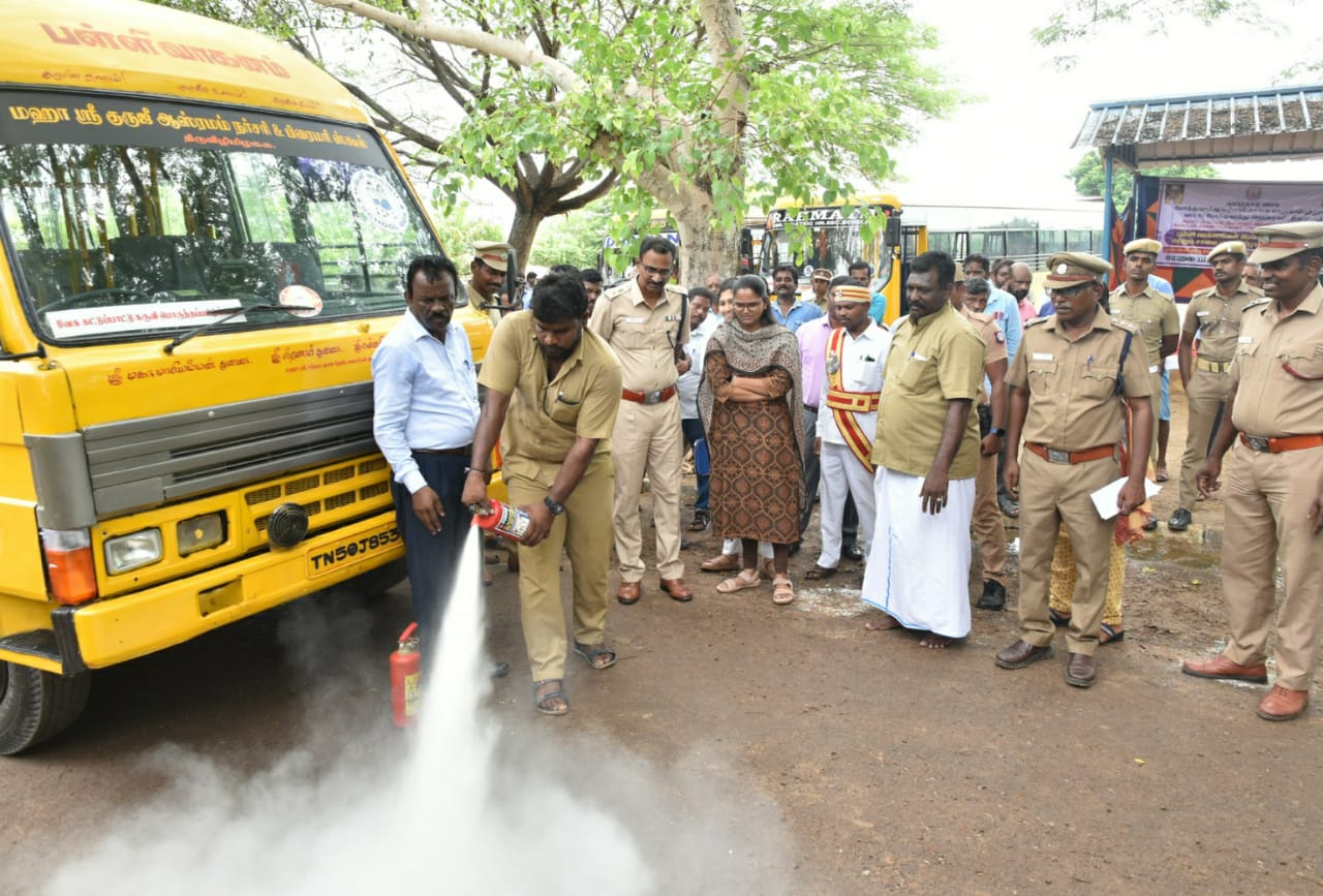இப்பள்ளி வாகனங்களில் கேமிரா பொருத்தப்பட்டுள்ளதா அவசர கால வெளியேறும் வசதி குழந்தைகள் எளிதாக வாகனத்தில் ஏற தாழ்வான படிக்கட்டுகள் பள்ளி வாகனம் என்ற அறிவிப்பு வேககட்டுப்பாட்டு கருவி பொருத்தப்பட்டுள்ளதா முதலுதவி பெட்டி தீயணைப்பு கருவி வைக்கப்பட்டுள்ளதா பிரதிப்பலிப்பான் வில்லை ஒட்டப்பட்டுள்ளதா என்று அரசு வழிகாட்டுதல் நெறிமுறைகள் குறித்து ஆய்வு மேற்கொள்ளப்பட்டது.