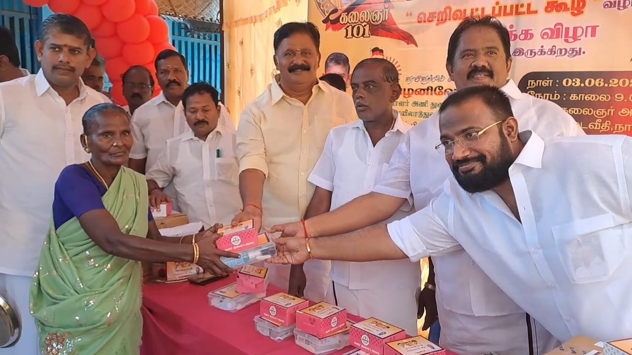 சீர்காழியை அடுத்த திருவெண்காட்டில் முத்தமிழர் அறிஞர் கலைஞரின் 101 வது பிறந்தநாள் விழா சீர்காழி சட்டமன்ற உறுப்பினர் எம் பன்னீர்செல்வம் கலந்து கொண்டு இனிப்புகள் வழங்கி நலத்திட்ட உதவிகளையும் வழங்கினார்
