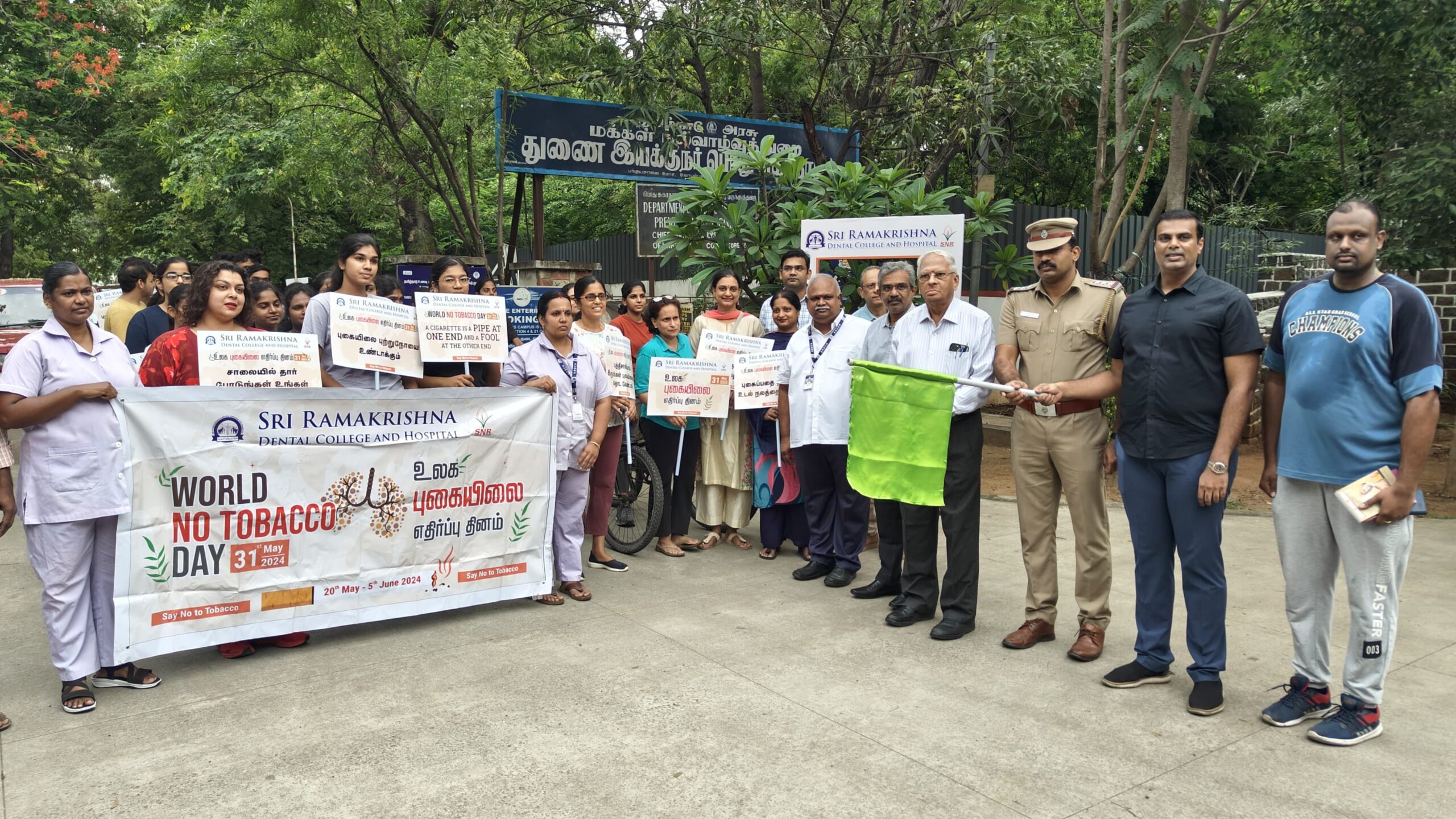 புகையிலை பழக்கத்தினால் ஏற்படும் தீய விளைவுகளை பற்றி விழிப்புணர்வு ஏற்படுத்த, ஒவ்வொரு வருடமும் உலக புகையிலை எதிர்ப்பு தினம் கொண்டாடப்படுகிறது. இதை முன்னிட்டு ஸ்ரீராமகிருஷ்ணா பல் மருத்துவக்கல்லுரி மற்றும் மருத்துவமனை சார்பாக நடைபெற்ற நிகழ்வில் கோவை பந்தய சாலை பகுதியில் எஸ் என் ஆர் சன்ஸ் அறக்கட்டளையின் – இணை நிர்வாக அறங்காவலர் சுந்தர் அவர்கள் தலைமை தாங்கி கொடியசைத்து விழாவினை தொடங்கி வைத்தார்.