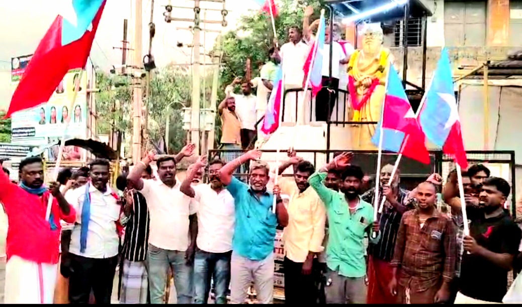 தொடர்ந்து கட்சி நிர்வாகிகள் பட்டாசு வெடித்து விட்டு பேருந்து நிலையத்திலிருந்து தந்தை பெரியார் சிலை வரை நடந்து சென்று பெரியார் சிலைக்கு மாலை அணிவித்து பட்டாசுகள் வெடித்து வெற்றியை கொண்டாடி மகிழ்ந்தனர்.