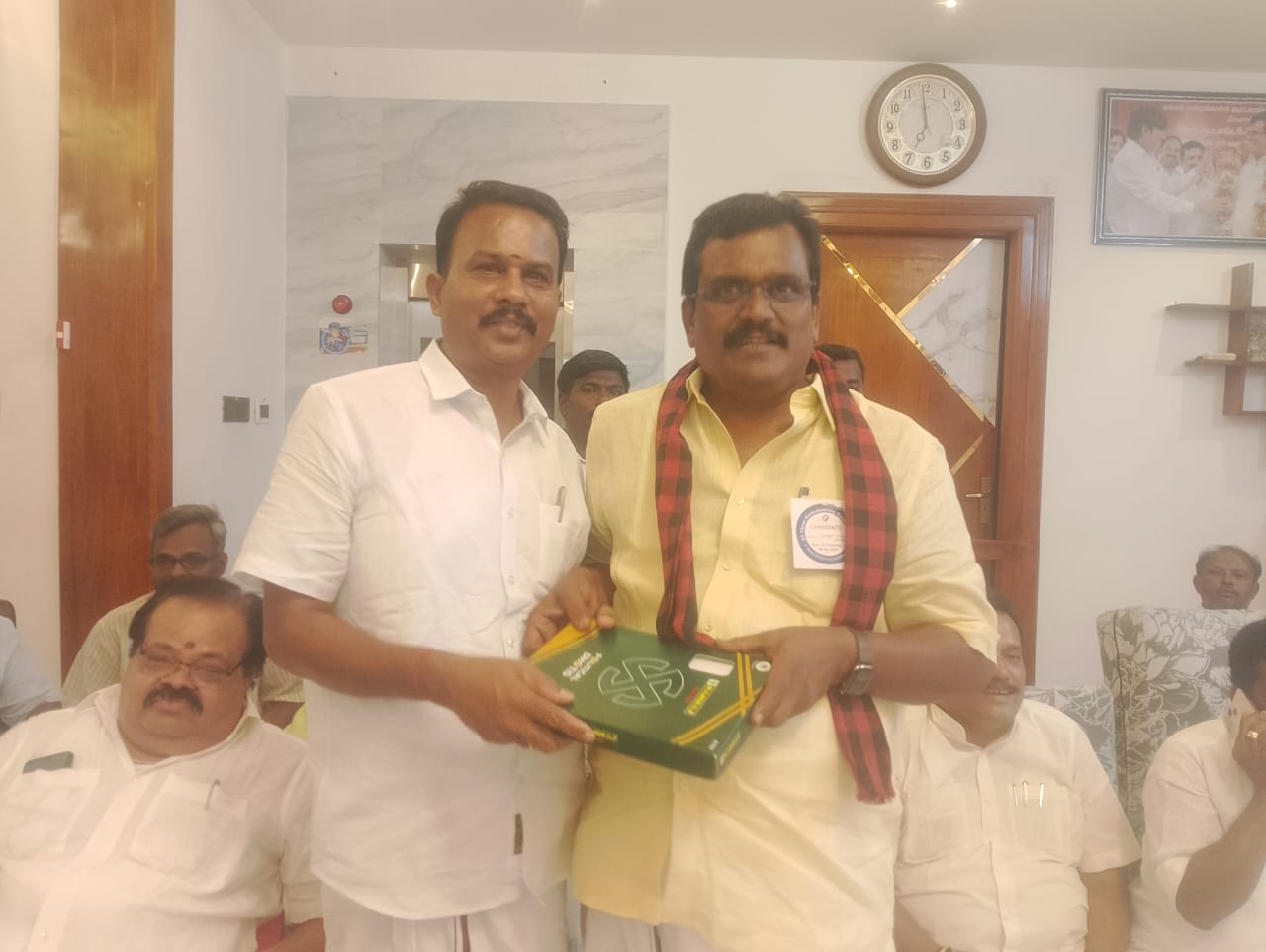 தேனி லோக்சபா தொகுதி எம் பி தங்க தமிழ்ச்செல்வன் குச்சனூர் பேரூராட்சி மன்ற தலைவர் பி டி ரவிச்சந்திரன் புத்தாடை வழங்கி ஆசி பெற்றார்