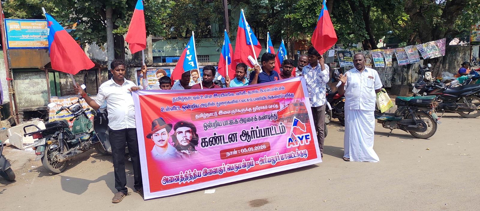 அமைப்பாளர் தமிழ்மொழி T.பலூர் தாமரைச்செல்வன் ஆகியோர் முன்னிலை வகித்தனர் அனைத்திந்திய இந்திய இளைஞர் பெருமன்ற தோழர்கள் அஜித் குமார் ராமன் ஹானஸ்ட்ராஜ் கேசவன் பரமேஸ்வரன் சுரேஷ் விக்னேஸ்வரன் திருமானூர் மருதமுத்து இந்திய கம்யூனிஸ்ட் கட்சியின் அரியலூர் ஒன்றிய செயலாளர் து பாண்டியன் ஆகியோர் ஆர்ப்பாட்டத்தில் கலந்து கொண்டனர் சுமார் 2 மணி நேரம் இந்த ஆர்ப்பாட்டம் நடந்தது