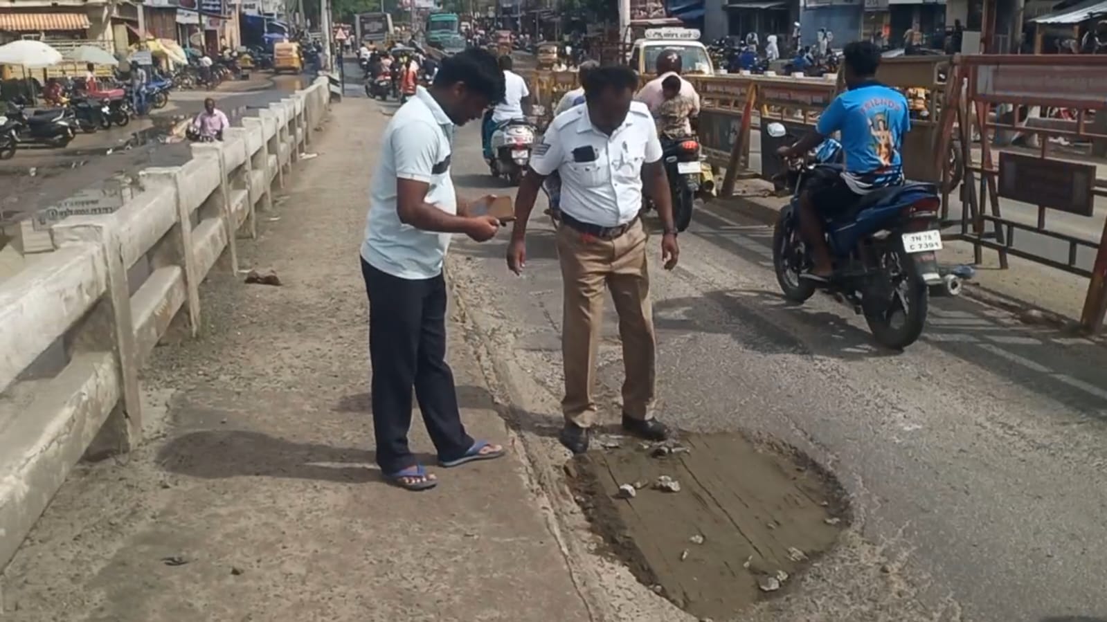திண்டுக்கல்லில் மேம்பால பள்ளத்தை சீரமைத்த தன்னார்வலர்கள் மற்றும் போக்குவரத்து காவலர்கள்.