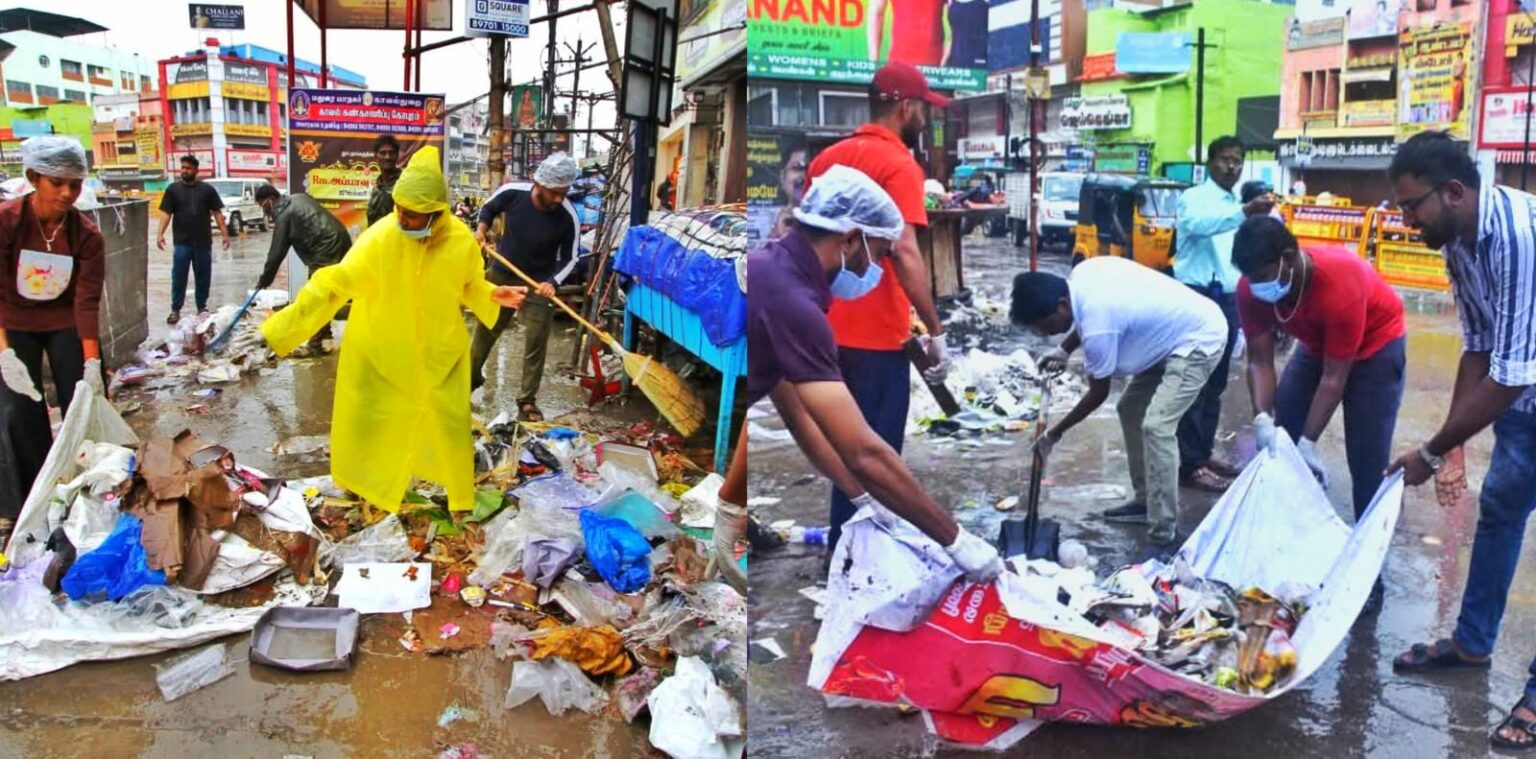 நேற்று அதிகாலை முதல் இரவு வரை மாநகர் பகுதியில் மழை பெய்துகொண்டே இருந்தது. ஆனாலும் தூய்மைப் பணியாளர்கள். நகரின் சாலைகள், குடியிருப்பு பகுதிகளில் தேங்கிய பட்டாக குப்பைகளையும், வழக்கமான குப்பைகளையும் அகற்றினர்.