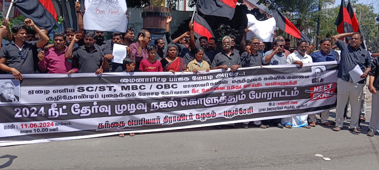 புதுச்சேரியில் தந்தை பெரியார் திராவிட கழகத்தின் சார்பில் நீட் தேர்வை ரத்து செய்ய சொல்லி அதன் நகலை எரித்து போராட்டம்