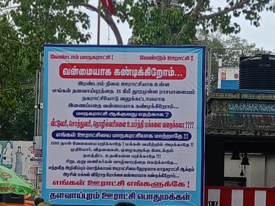 சம்பந்தப்பட்ட ஊராட்சி மக்களிடம் கருத்துக்கேட்பு கூட்டம் நடத்தாமல் மாநகராட்சியாக தரம் உயர்த்தும் இந்த திட்டத்தை கைவிடும் வரை அறவழியில் சட்டத்திற்குட்பட்டு மக்களை ஒன்றுதிரட்டி மிகப்பெரிய போராட்டம் நடத்தப்படும் என்று கூறப்படுகிறது