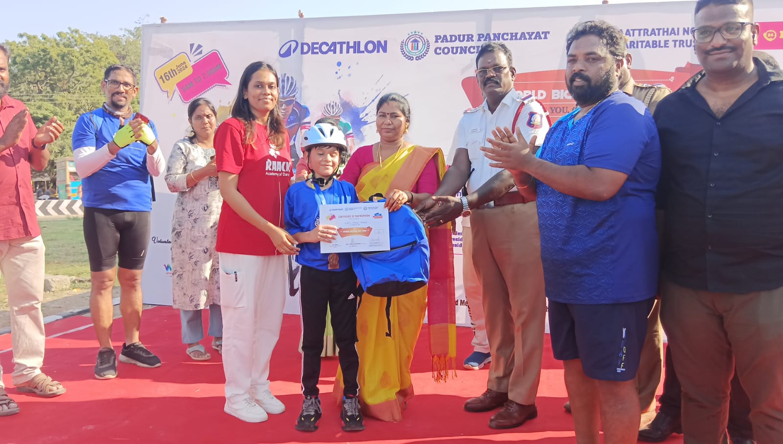 இதில் சிறியவர்களுக்கான 10 கிலோ மீட்டர், பெரியவர்களுக்கான 30 கிலோ மீட்டர் என இரு பிரிவுகளாக நடைபெற்ற சைக்கிள் பேரணியில் படூர் அரசு பள்ளி மாணவர்கள், இளைஞர்கள், வயதானவர்கள் உள்ளிட்ட 100 க்கும் மேற்பட்டோர் கலந்து கொண்டனர் பங்கேற்ற அனைவருக்கும் சான்றிதழுடன் பதக்கமும் வழங்கப்பட்டது,