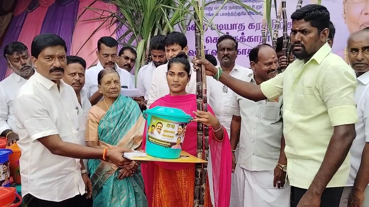 சீர்காழி அருகே 550க்கும் மேற்பட்ட குடும்பங்களுக்கு சொந்த செலவில் பச்சரிசி, வெல்லம், முந்திரி, திராட்சை, நெய், 2 முழு கரும்பு உள்ளிட்ட பொருட்கள் கொண்ட பக்கெட்டுடன் கூடிய பொங்கல் தொகுப்பு. வழங்கிய அதிமுக நகர்மன்ற பெண் உறுப்பினர்.