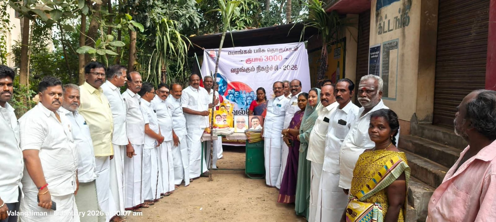 இதைத் தொடர்ந்து அனைத்து பகுதிகளிலும் பொங்கல் பரிசு தொகுப்பு வழங்கப்பட்டு வருகிறது. இதனைத் தொடர்ந்து வலங்கைமானில் திமுக மேற்கு ஒன்றிய செயலாளர் வீ.அன்பரசன் தலைமையில், கிழக்கு ஒன்றிய திமுக செயலாளர் நரசிங்க மங்கலம் கோ. தெட்சிணாமூர்த்தி, பேரூர் திமுக செயலாளர் பா.சிவநேசன் ஆகியோர் முன்னிலையில் அரிசி அட்டைத்தாரர்களுக்கு வேஷ்டி,சேலை, ஒரு கிலோ பச்சை அரிசி, சர்க்கரை, ஒரு முழு கரும்பு, ரொக்கம் ரூபாய் 3000 வழங்கி தொடங்கி வைக்கப்பட்டது.