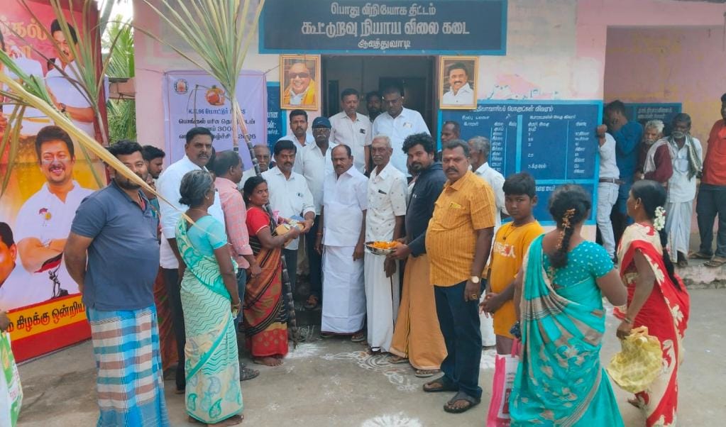 காவேரிப்பட்டினம் அருகில் உள்ள ஆவத்துவாடி கிராமத்தில் உள்ள ரேஷன் கடை யில், குடும்ப அட்டைதாரர் களுக்கு பொங்கல் பரிசுத் தொகுப்பான ரூ.3 ஆயிரம் ரொக்கம், ஒரு கிலோ பச்சரிசி, ஒரு கிலோ சர்க்கரை மற்றும் இலவச வேட்டி, சேலை, முழு கரும்பு ஆகியவற்றை திமுக மாவட்ட அவைத்தலைவர் நாகராஜ் குடும்ப அட்டைதாரர் களுக்கு வழங்கினார்.