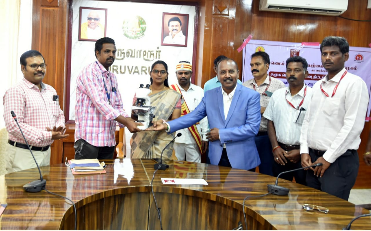 ஓ.என்.ஜி.சி சமுக பொறுப்புணர்வு திட்டத்தில் சுமார் 6.84 இலட்சம் மதிப்பில் 20 எண்ணிக்கையில் வழங்கிய பைனாகுலர் மைக்ராஸ்கோப் கருவிகளை திருவாரூர் மாவட்ட ஆட்சித்தலைவர் அவர்கள், ஓ.என்.ஜி.சி முதன்மை பொதுமேலாளர் மனித வள தலைமை அதிகாரி முன்னிலையில் திருவாரூர் மாவட்ட காசநோய் கழகத்திற்கு திருவாரூர் மாவட்ட காசநோய் துணை இயக்குனர் அவர்களிடம் வழங்கினார்