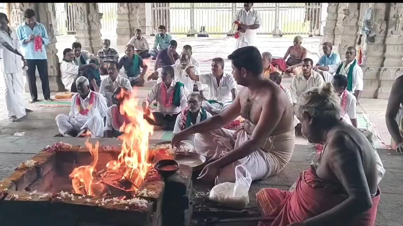 சீர்காழி அருகே வைத்தீஸ்வரன் கோயில் அருள்மிகு வைத்தியநாத சுவாமி கோவிலில் மாவட்ட ஆட்சியர் நலம் பெற வேண்டிய தமிழ்நாடு காவிரி விவசாயிகள் சங்கம் சார்பாக ஆயுஷ் ஹோமம் நடைபெற்றது விவசாயிகள் மற்றும் வேளாண் துறை அதிகாரிகள் பங்கேற்பு.
