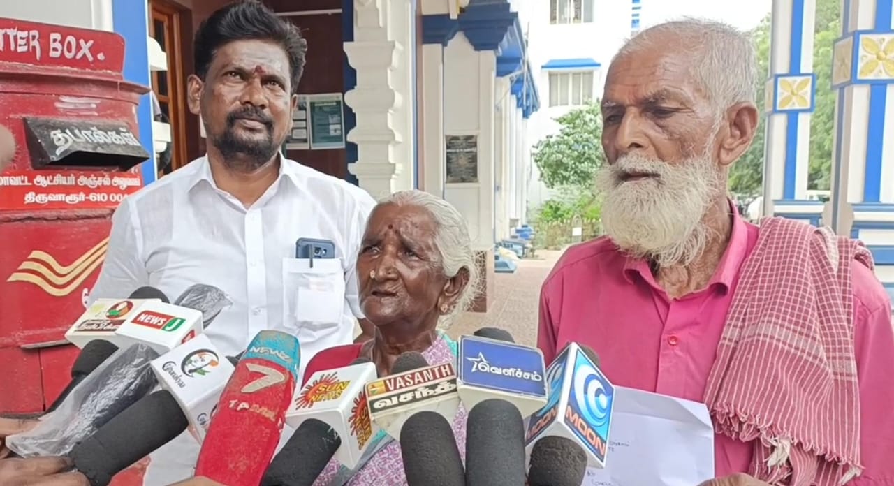 திருவாரூர் அருகே குடவாசல் பகுதியில் உள்ள கிராமத்தில் ஊரை விட்டு ஒதுக்கி வைத்ததால் வயதான தம்பதியினர் மாவட்ட ஆட்சியர் அலுவலகத்தில் நடவடிக்கை எடுக்க கோரி மனு.