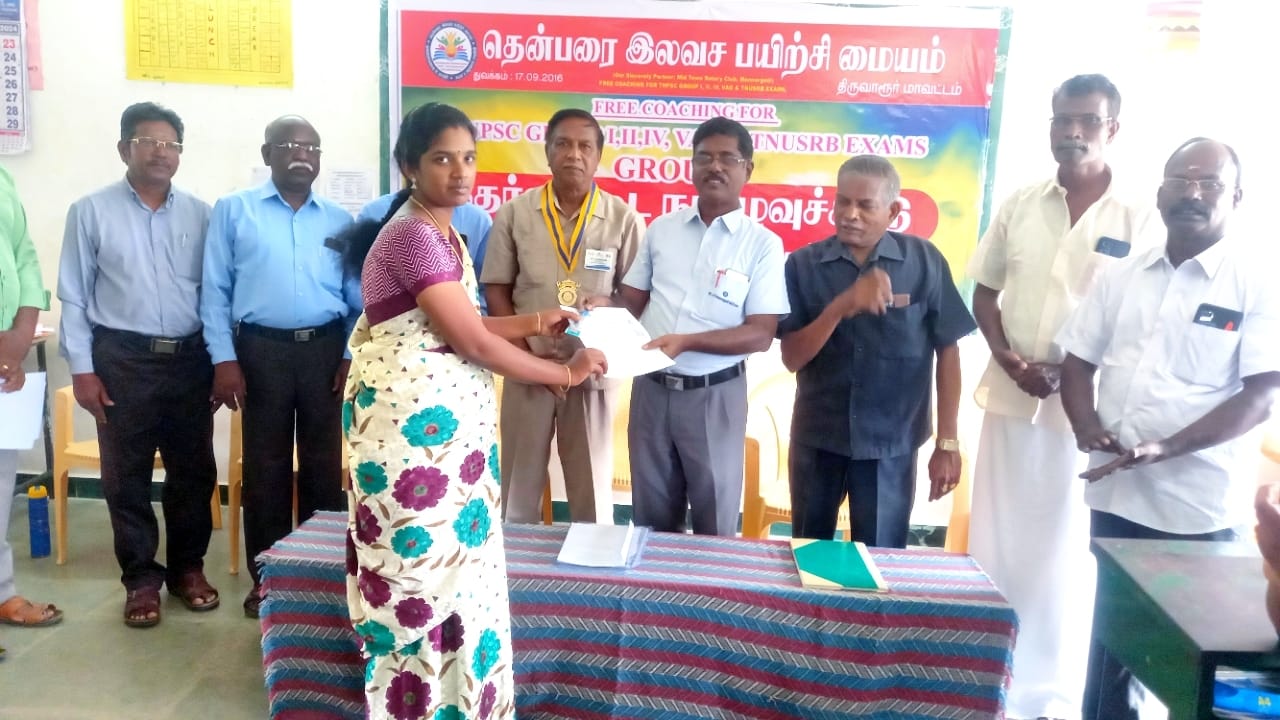 திருவாரூர் மாவட்டம் மன்னார்குடி அருகே தென்பரை இலவச பயிற்சி மையம் கடந்த 2016 முதல் கிராமப்புற இளைஞர்களுக்கு போட்டித்தேர்வு எழுதுவதற்கான இலவச பயிற்சி வகுப்பை நடத்தி நூற்றுக்கு மேற்பட்டோர் வெற்றி பெற்று அரசு பணியில் அமர்த்தி வருகிறது .