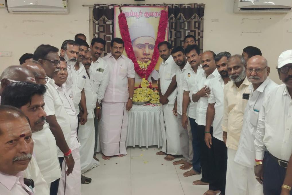 கரூர் மாவட்டம் கலைஞர் அறிவாலயத்தில் கரூர் மாவட்ட திமுக சார்பில் விடுதலைப் போராட்ட வீரர் கொடிகாத்த திருப்பூர் குமரனின் 94வது நினைவஞ்சலி முன்னிட்டு மலர் தூவி மரியாதைசெலுத்தினர்.