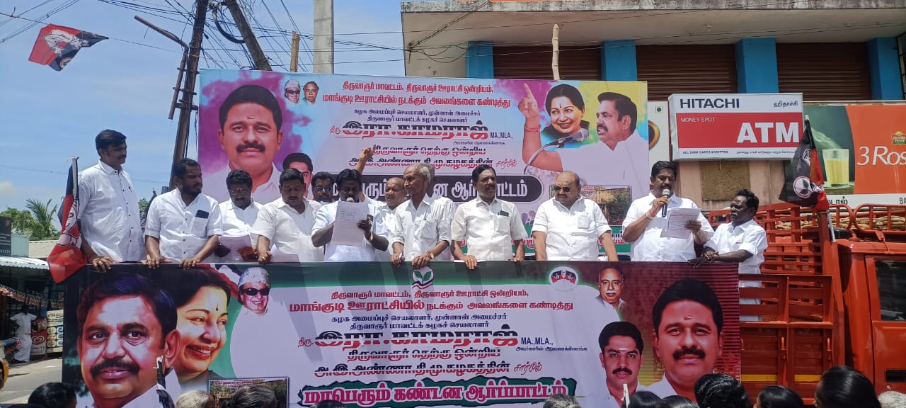 திருவாரூரில் ரூ. 1 கோடி மதிப்புள்ள பொது சொத்தை பட்டா மாற்றி அபகரிப்பில் ஈடுபட்டுள்ள மாங்குடி திமுக ஊராட்சி மன்ற தலைவரை கண்டித்து அதிமுக சார்பில் கண்டன ஆர்ப்பாட்டம் நடைபெற்றது.