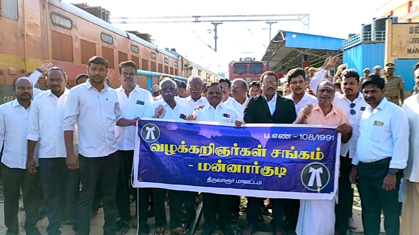 அதன் ஒரு பகுதியாக திருவாரூர் மாவட்டம் மன்னார்குடியில் வழக்கறிஞர்கள் மன்னைநகரில் இருந்து பேரணியாக சென்று இரயில் நிலையத்தில் மன்னார்குடியில் இருந்து மயிலாடுதுறை செல்லும் பயணிகள் ரயிலை மறித்து ஒன்றிய அரசை கண்டித்து கண்டன முழக்கங்கள் எழுப்பி ரயில் மறியல் போராட்டத்தில் ஈடுபட்டனர்.