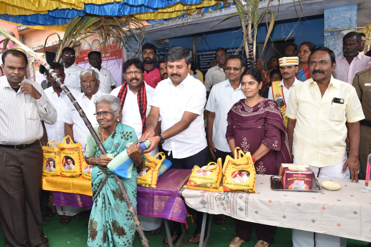பொங்கல் பரிசாக 1 கிலோ பச்சரிசி, 1 கிலோ சர்க்கரை, 1 முழுக் கரும்பு, வேட்டி,சேலை மற்றும் ரூ.3,000 ரொக்கம் ஆகியவை அடங்கிய தொகுப்பினை வழங்கிட தமிழ்நாடு முதலமைச்சர் உத்தரவிட்டு அதன்படி குடும்ப அட்டைதாரர்களுக்கு பொங்கல் பரிசு தொகுப்புகள் தொடர்ந்து வழங்கப்பட்டு வருகின்றத. அதனுடன் வேட்டி சேலைகளும் வழங்கப்படுகின்றது.