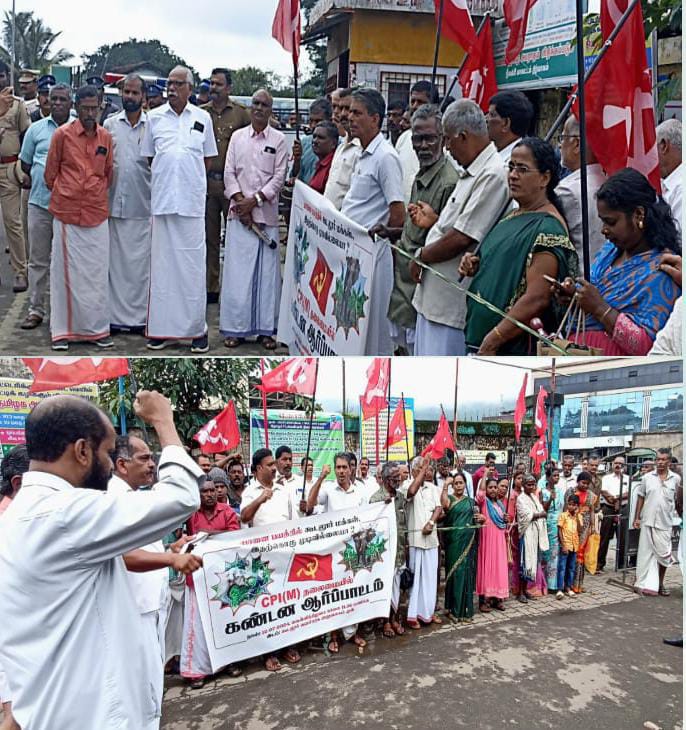 யானை மற்றும் வனவிலங்குகளிடமிருந்து மக்களை பாதுகாக்க வனத்துறையும்,தமிழக அரசும் உரிய நடவடிக்கை எடுக்க வேண்டியும்,வன விலங்குகளால் உயிர் பாதிப்பு ஏற்படும் பொழுது அக்குடும்பத்தினருக்கு உரிய இழப்பீடு மற்றும் அரசு வேலை வழங்க வேண்டும் என வழியுறுத்தி சிபிஎம் கட்சி சார்பாக கூடலூர் புதிய பேருந்து நிலையம் அருகில் கண்டன ஆர்ப்பாட்டம் நடைபெற்றது.