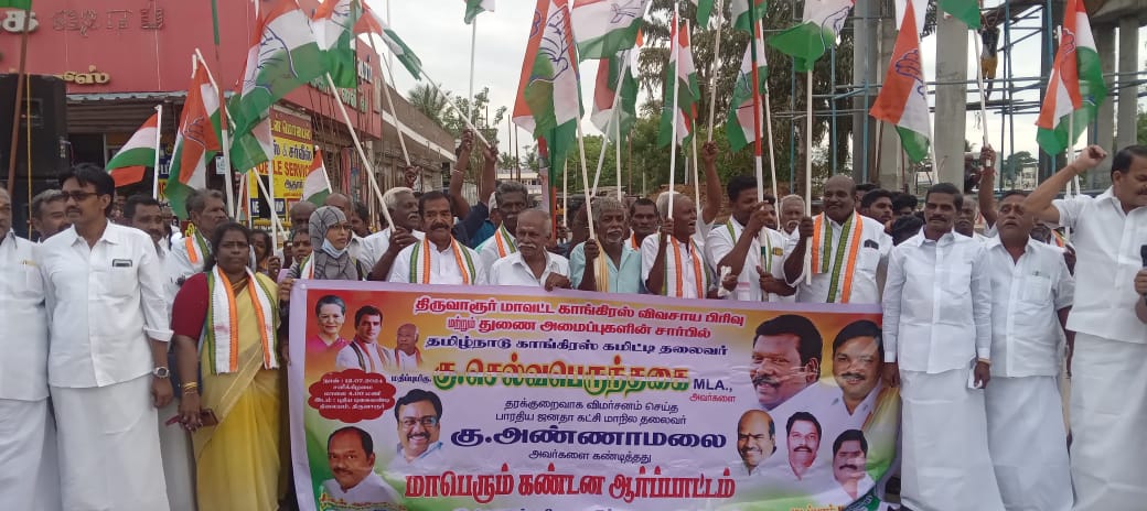 இந்திய தேசிய காங்கிரஸ் கட்சியின் தமிழ்நாடு மாநில தலைவர் செல்வப் பெருந்தகையை தரக்குறைவாக விமர்சித்து தமிழ்நாடு பாஜக தலைவர் அண்ணாமலை பேசியதை கண்டித்து தமிழகம் முழுவதும் காங்கிரஸ் திமுக கம்யூனிஸ்ட் விடுதலை சிறுத்தைகள் உள்ளிட்ட கட்சியினர் ஆர்ப்பாட்டத்தில் ஈடுபட்டு வருகின்றனர்