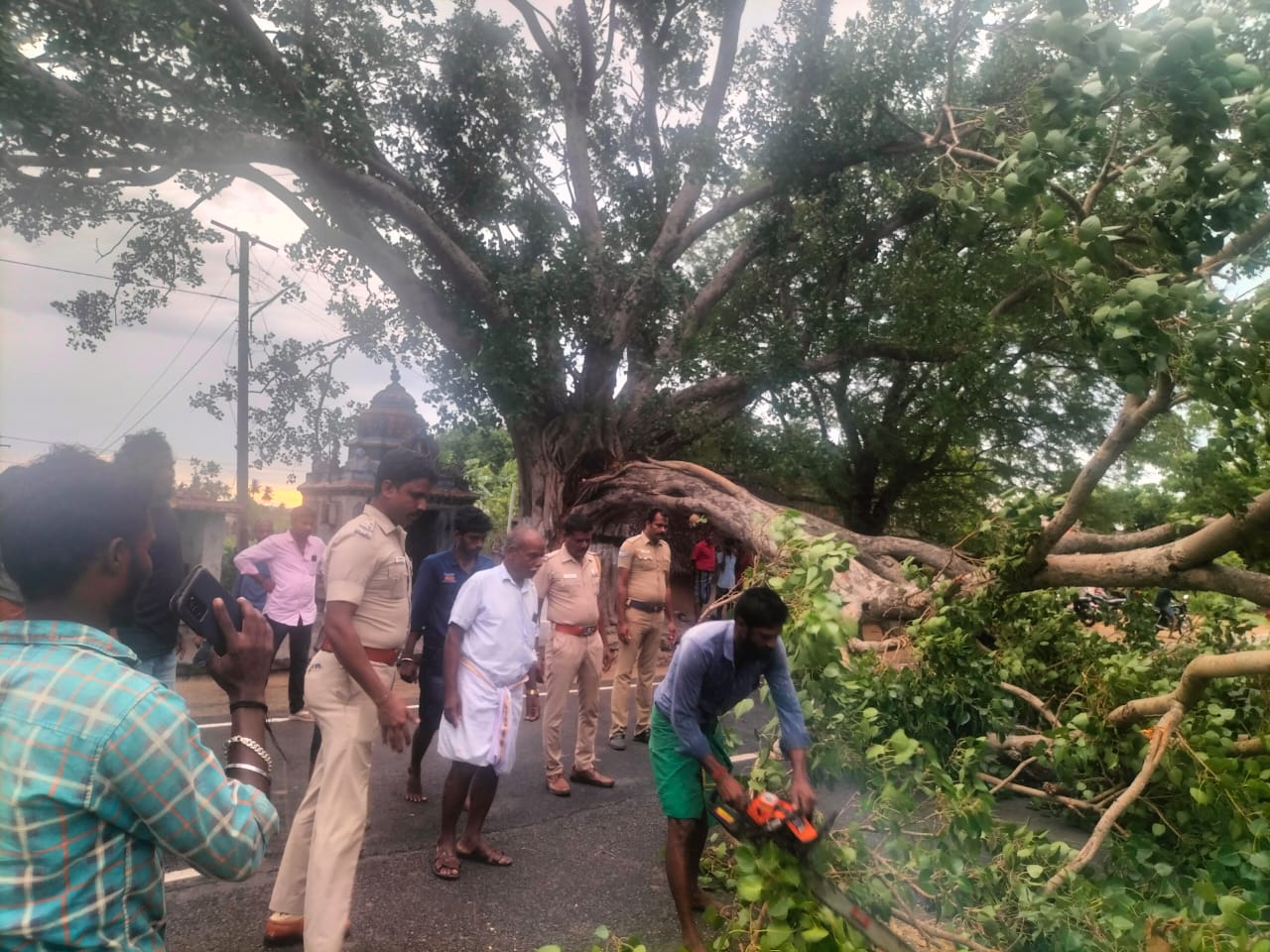 திண்டிவனத்தில் இருந்து காஞ்சிபுரம் செல்லும் ரோட்டில் மேல் மாவிலங்கை என்னும் இடத்தில் பலத்த காற்றின் காரணமாக அரசமரம் முறிந்து நடுரோட்டில் விழுந்தது தகவல் அறிந்து வெள்ளிமேடு பேட்டை காவல் உதவி ஆய்வாளர் விஜயகுமார் சிறப்பு உதவி ஆய்வாளர் அருள்தாஸ் மற்றும் காவல்துறையினர் உடனடியாக விரைந்து வந்து ஜேசிபி இயந்திரம் மூலம் மரத்தை அகற்றி போக்குவரத்தை சரி செய்தனர்