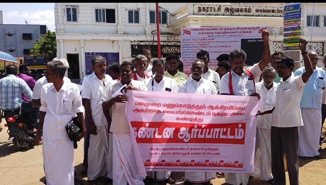 அரியலூர் மாவட்டம் ஜெயங்கொண்டம் 1வது வார்டு பகுதியில் தனிநபர் பொது பாதையை ஆக்கிரமித்து போக்குவரத்துக்கு இடையூறு ஏற்படுத்தி வரும் நபர் மீது பலமுறை மனுக்கள் கொடுத்தும் ஆக்கிரமிப்பை அகற்றாத நகராட்சி நிர்வாகத்தை கண்டித்து தீரன் நகர் குடியிருப்பு நல சங்கம் தலைவர் ராமநாதன் தலைமையில் அந்தப் பகுதி மக்கள் கண்டன ஆர்ப்பாட்டத்தில் ஈடுபட்டனர்
