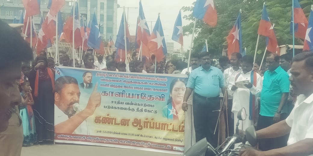 விடுதலை சிறுத்தை கட்சி கண்டன ஆர்ப்பாட்டம் தலைமை தமிழ் வேந்தன் மேனாள் மாவட்ட செயலாளர் கண்டன உரை தா பார்வேந்தன் மாநிலச் செயலாளர் உயர்நீதிமன்ற வழக்கறிஞர் சுசி கலையரசன் மேனாள் மண்டல செயலாளர் எஸ் எம் எல் ஏ சிறுத்தை வள்ளுவன் மண்டல செயலாளர் திருப்பூர் ஈரோடு தம்பி முருகானந்தம் நாடாளுமன்ற தொகுதி துணை செயலாளர் ரேவதி மகளிர் விடுதலை இயக்கம் ஆகியோர் தலைமையில் கண்டன ஆர்ப்பாட்டம் திருப்பூர் மாவட்ட ஆட்சியர் அலுவலகம் முன்பு நடைபெற்றது