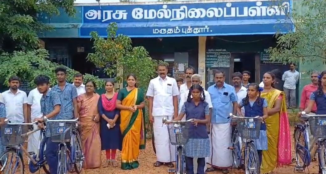 தென்காசி மாவட்டம் ஆலங்குளம் ஊராட்சி ஒன்றியம் மருதம்புத்தூர் அரசு மேல் பள்ளியில் தமிழக அரசு வழங்கும் விலையில்லா மிதிவண்டி வழங்கும் விழா நடைப்பெற்றது