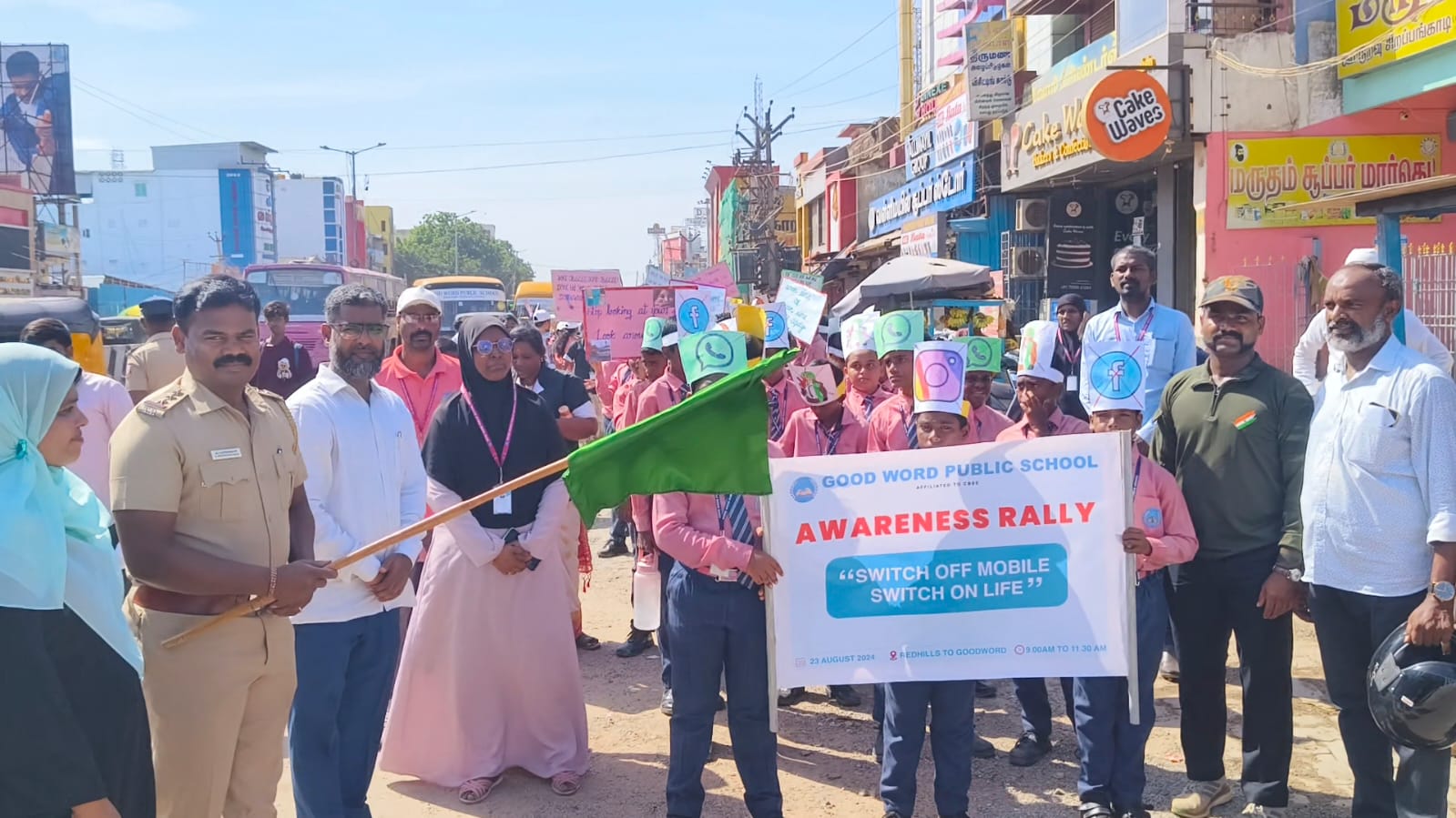 மாணவ மாணவிகள் சுவிட்ச் ஆப் மொபைல் போன் சுவிட்ச் ஆன் லைஃப் என்ற தலைப்பில் செல்போன் உபயோகத்தை குறைக்கவும் அதனால் ஏற்படும் தீமைகள் பற்றி எடுத்துரைக்கும் பேரணியை தனியார் பள்ளி மாணவ மாணவிகள் நடத்தினர்.